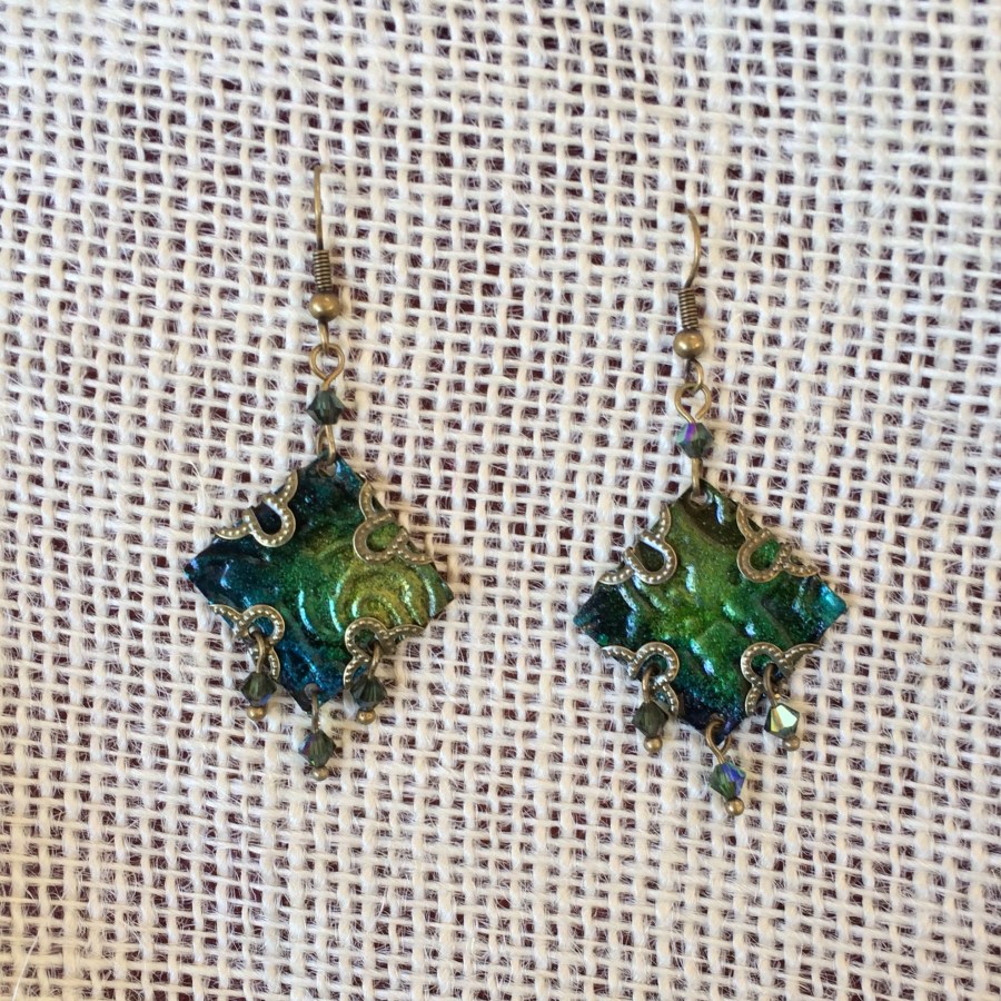 Iris in Sapphire Earrings This pair is delicately painted in blues and greens and wrapped in Indian filigree and finished with Swavorski crystals