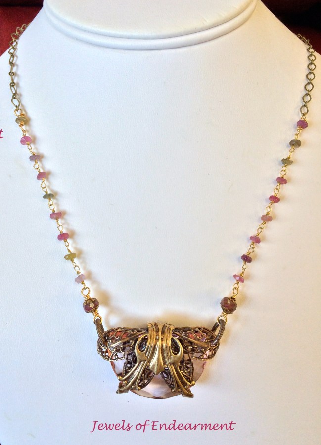 Regency Embellished Necklace A lovely blush faceted antique glass wrapped in fine filigree is accented by tourmaline rondelles.